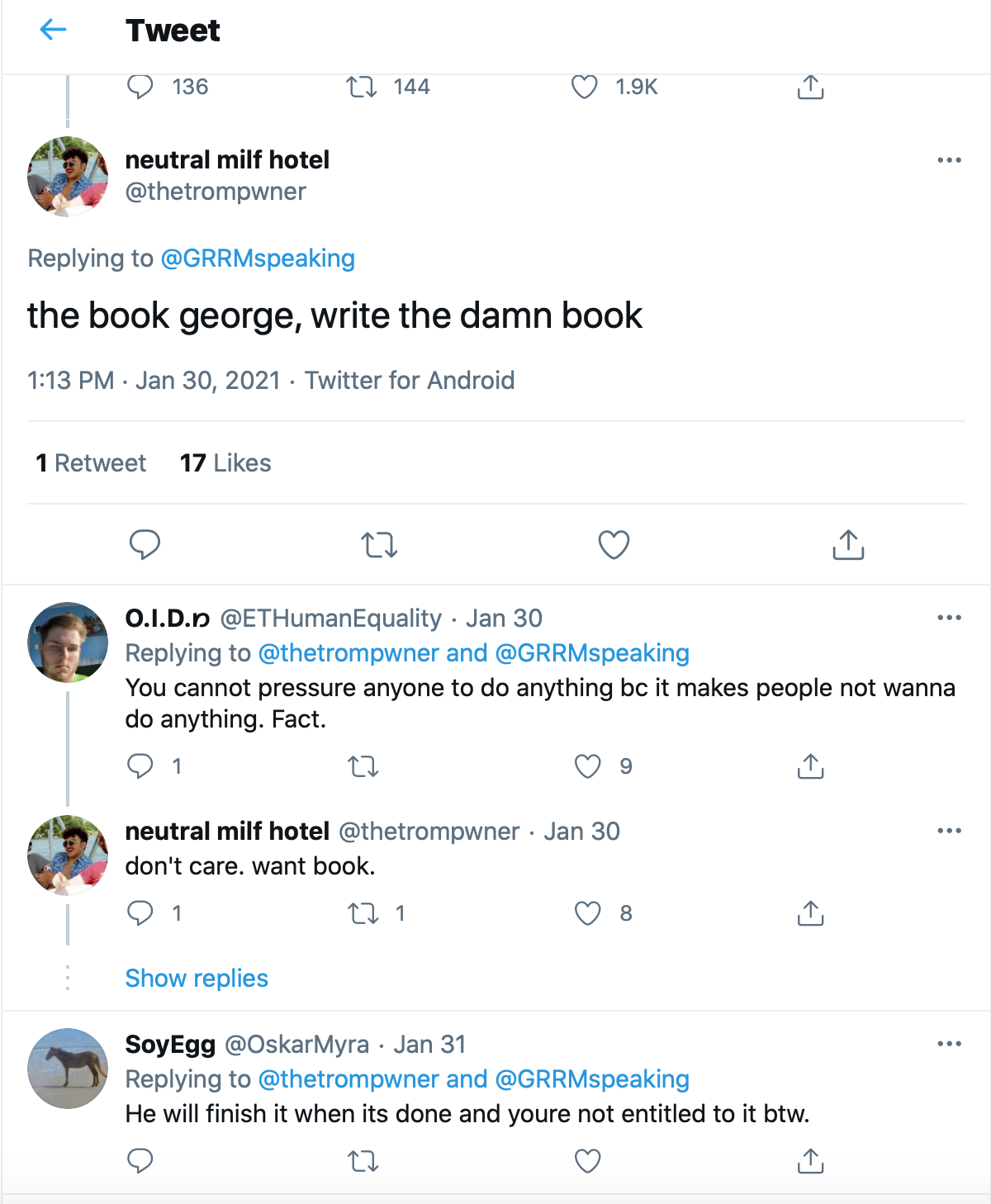 Speaking of Twitter, there’s an age-old question on George R.R. Martin’s Twitter page with everything he posts: “Hey George, are you done with the book yet?” This, of course, refers to the extremely slow progress Martin is making on his next book in the Game of Thrones series, The Winds of Winter. The television series has lapped him and has left his hardcore fans wondering if, indeed, he will ever finish the series.